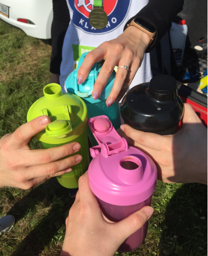 A málem bych zapomněla – když to byl ten snídaňový běh, tak jsme zakončili vydatným proteiňákem – do závodů prostě chodíme se vším všudy a naplno.